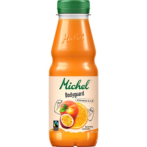 Wasser, Orangensaft* (35%) aus fairem Handel, Pfirsichmark* (10%), Fructosesirup, Passionsfruchtsaft* (5%), Säuerungsmittel (Zitronensäure), Stabilisator (Pektin), Vitamine A, C und E. *aus Konzentrat.